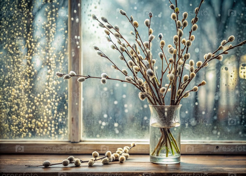 Большой план букета ивы в стеклянной вазе на фоне старого белого окна с капельками дождя на стекле
