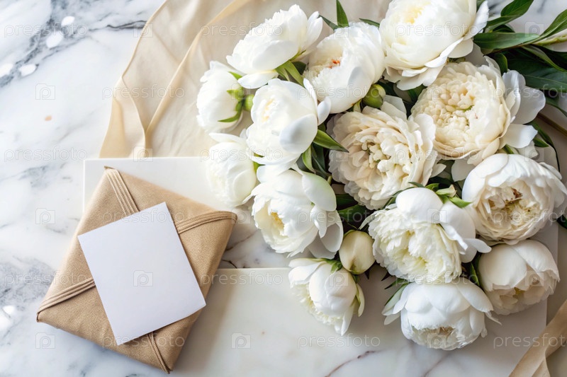 Пустая схема поздравительной открытки и красивый букет белых пионьев. Цветы на светло-сером фоне и пустой лист бумаги. Вид сверху