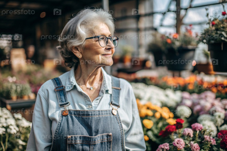 Пожилой садовник с седыми волосами в комбинезоне в уютной цветочной теплице