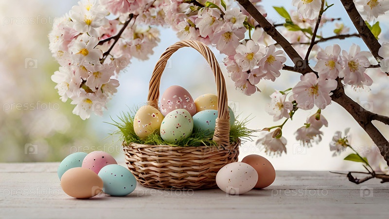 Красивый фон с пасхальными яйцами в плетеновой корзине и весенними вишневыми цветами