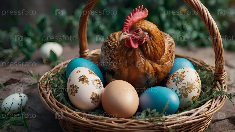 Нежная деревня пасхальных яиц и курицы в плетеновой корзине