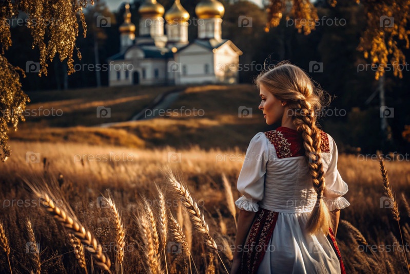 Девушка в традиционном русском льняном наряде и с сковородой на голове на поле спелой золотистой пшеницы на фоне березы и православной церкви