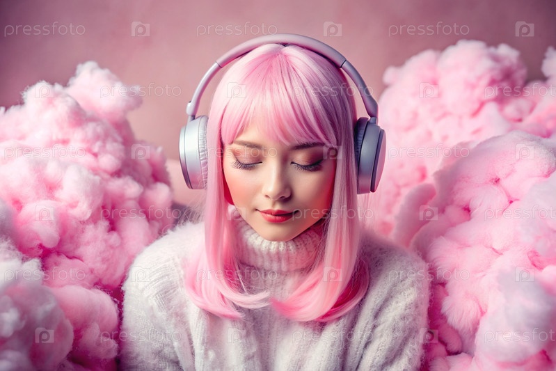 Молодая красивая японская девушка с розовыми волосами в аниме слушает музыку на беспроводных наушниках в розовых облаках