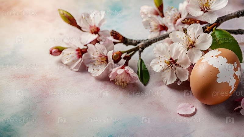 Нежные пасхальные яйца и вишневые ветви цветут на пастельном акварельном фоне с нежными полосками