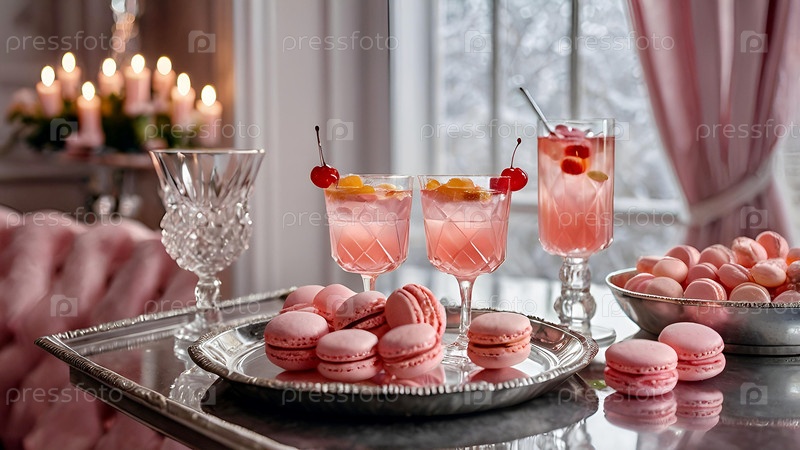 Элегантные мягкие розовые коктейли с льдом и морозом в винтажных бокалах на серебряном подносе с вишней и макаронами