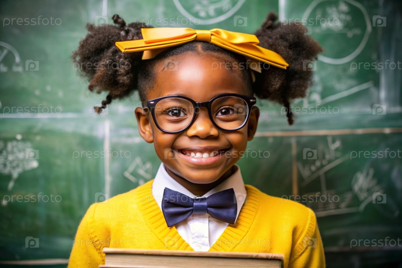 Красивая афроамериканская девушка с очками и книгами. Ребенок впервые ходит в школу. Ребёнок в классе с доской