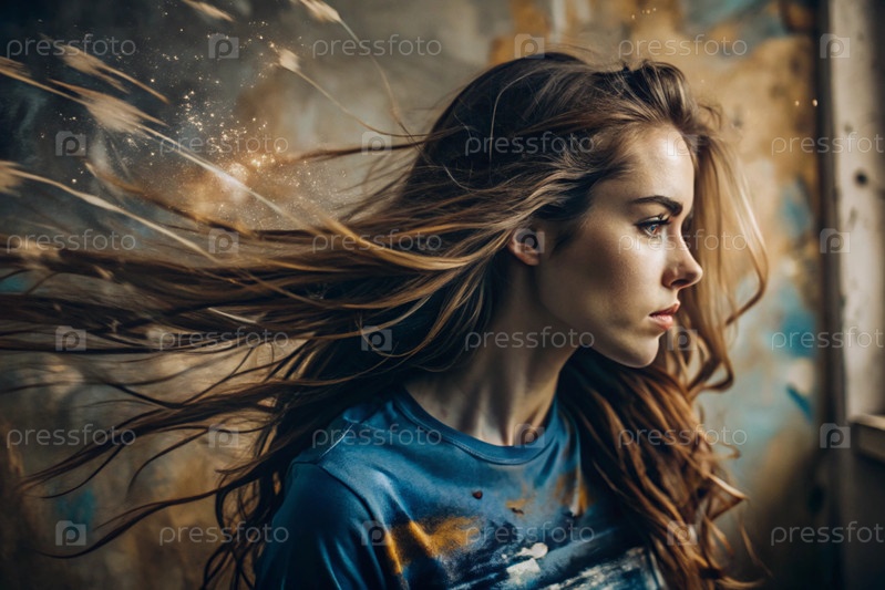 Портрет красивой молодой девушки с продуманным взглядом. волосы развиваются и создают ощущение легкости и естественности