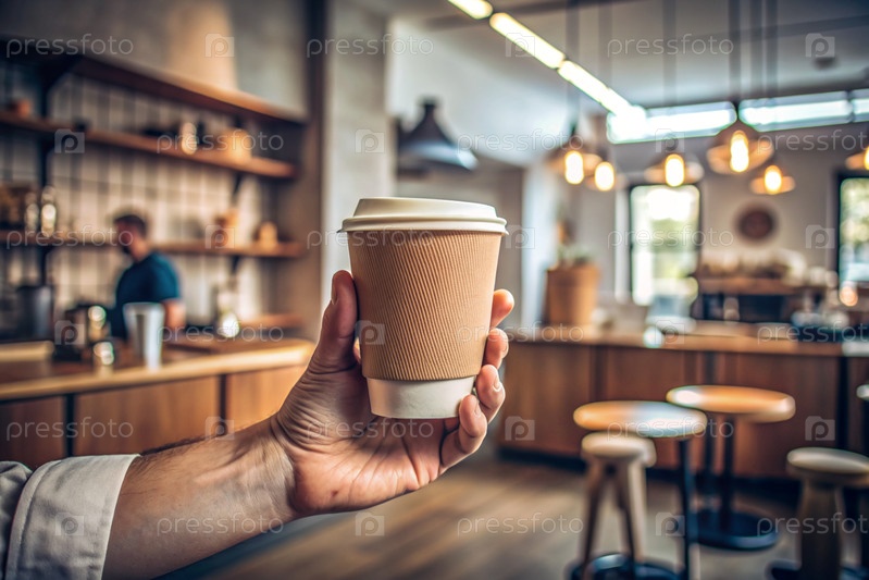 Экологически чистый одноразовый бумажный стакан с кофе на столе в руках бариста на размытом фоне кофейни
