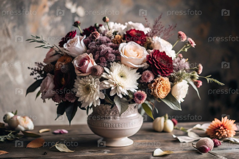 Красочное лето, осенний букет цветов различных красных, розовых и белых оттенков в вазе на столе