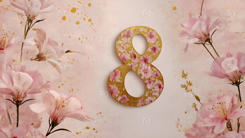 Международный женский день. праздник приходится на 8 марта. баннер, флаер. торжественный, нежный розовый цветочный фон с номером 8