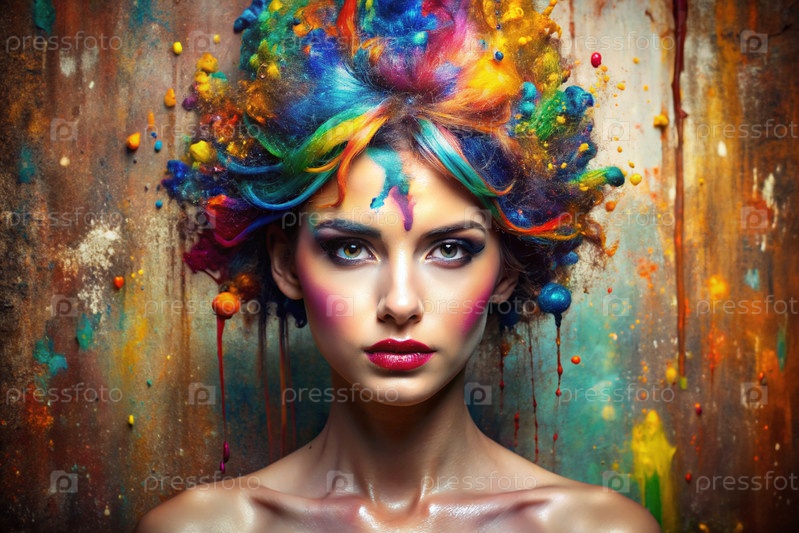 Творческий баннер для салона красоты или парикмахера. Модное профессиональное окрашивание волос. Красивая женщина с длинными многоцветными волосами. Взрыв цветов на голове