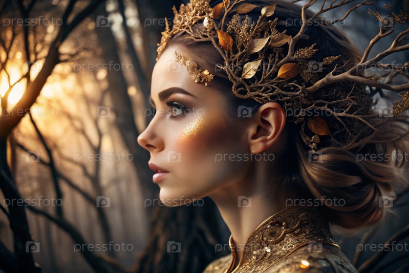 Творческий баннер для салона красоты в черно-золотом цвете. Красивая женщина, окруженная лесом с макияжем и волосами. Золотые ветви дерева в волосах. Индустрия красоты
