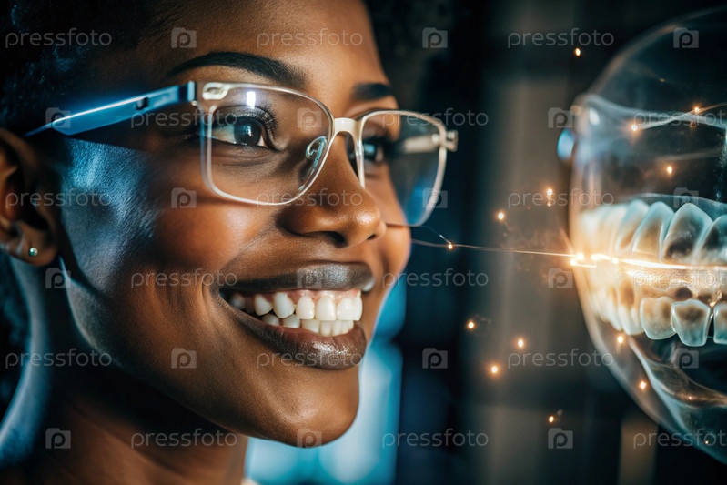 Новые технологии цифрового искусственного интеллекта в зубных протезах. Имплантаты. Чернокожая женщина-стоматолог с идеальной улыбкой и цифровой стоматологической графикой на виртуальном экране. Концепция здоровья зубов и ухода за зубами