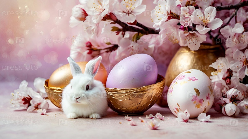 Нежные пасхальные яйца, белый кролик и вишневые ветви на фоне пастельного акварели с нежными полосками