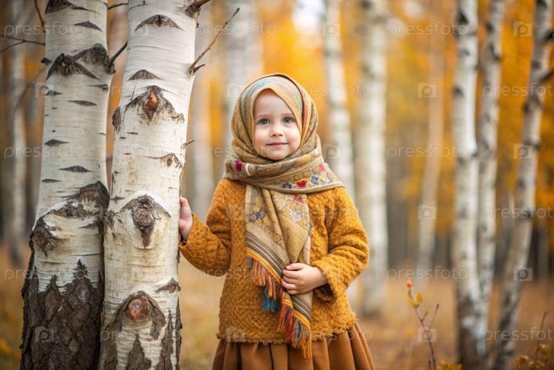 Русские народные традиции.Русский аромат.Красивая девочка в национальном русском платье и шаль в прекрасном березовом роще осенью.Портрет красивой девушки в березном лесу