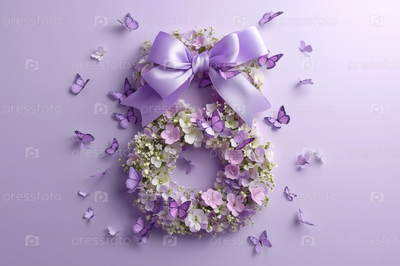 Международный женский день. баннер, флаер, красивая открытка на 8 марта. цветы в форме цифры восемь и бабочки на лиловом фоне