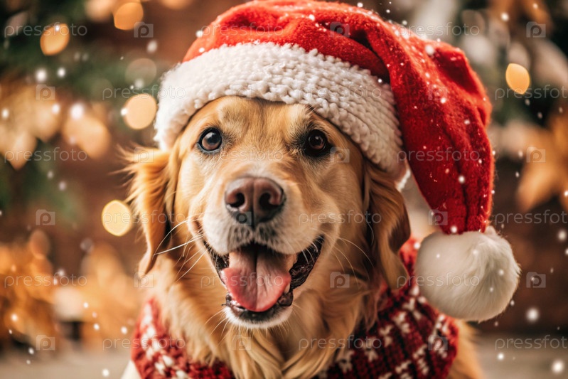 С Новым годом и Рождеством! Падает снег. Веселая собака Золотой ретривер сидит в шляпе Санта-Клауса