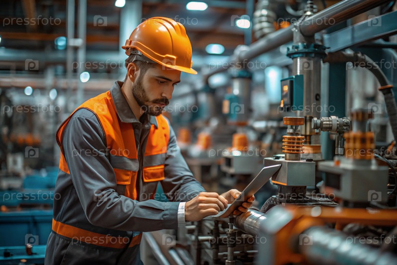 Профессиональный инженер, рабочий, техник в шлеме проверяет и работает на машине на заводе по производству запчастей