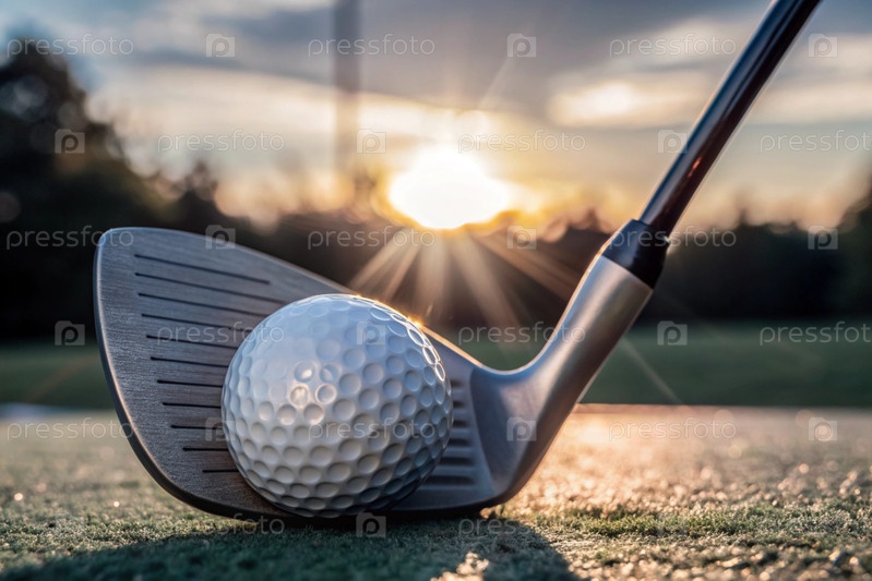 Баннер. белый мяч и металлическая клюшка для гольфа лежат на газоне в руках мужчины среди заката солнца. реклама матча по гольфу в кантри-клубе. свободное место для текста