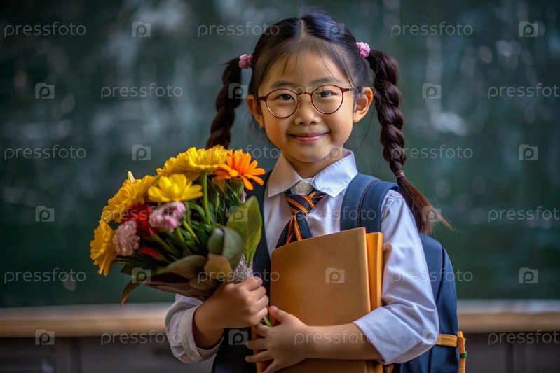 Первоклассный азиат с очками на доске. Девушка держит цветы в руках. Ребенок пойдет в школу впервые. Ребёнок с рюкзаком, книгой и цветами. Возвращение к школе