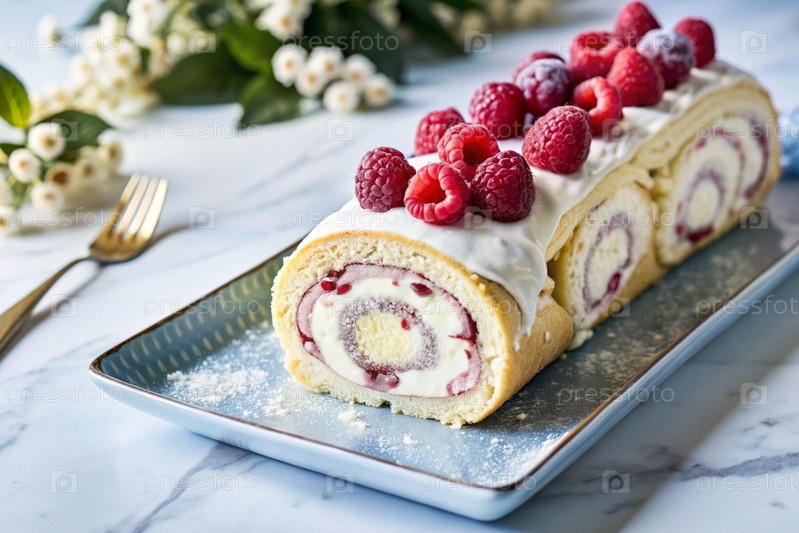 Швейцарская губка с малиной, вкусный фруктовый и сливочный десерт наполненный кремовым сыром, украшенный свежими малинами