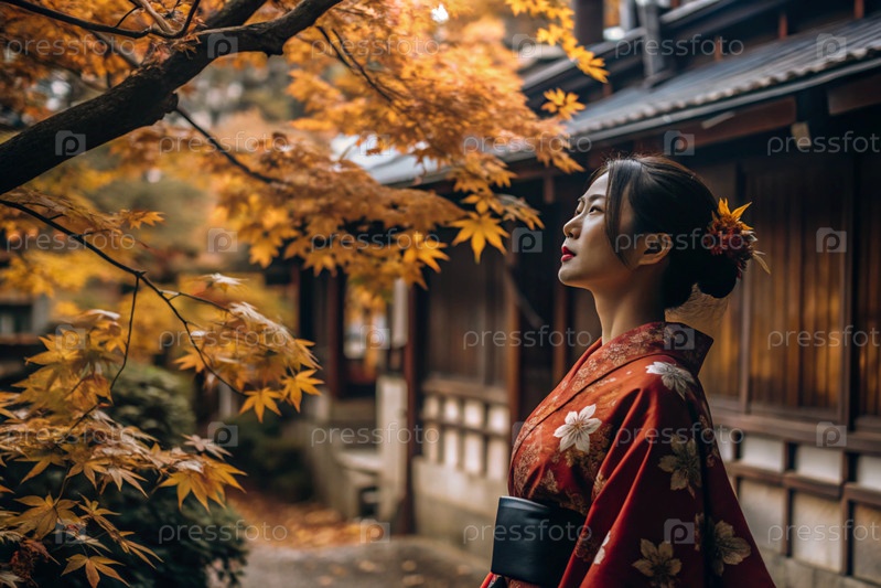 Японская девушка в традиционном национальном костюме - кимоно. На сказочном фоне фонарики и осенние деревья. Портрет символизирует традиции и культуру народа Японии
