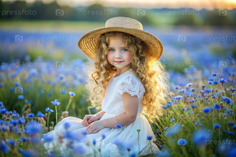 Портрет красивой кудрявой девушки в соломенной шляпе и белом платье в цветущем саду из голубых цветов. Детство. Девочка позирует и смотрит в камеру