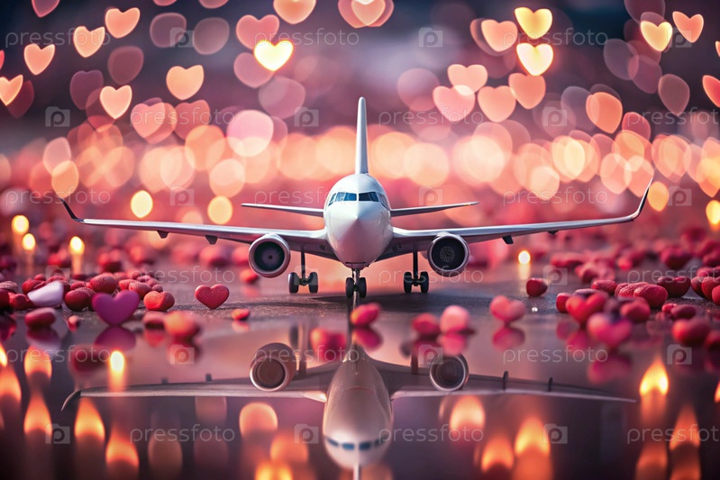 Любовное путешествие. Самолет и сердца вокруг. Подарок для любимого человека в День святого Валентина похож на романтическую поездку. Баннер с предложениями и акциями от туроператора