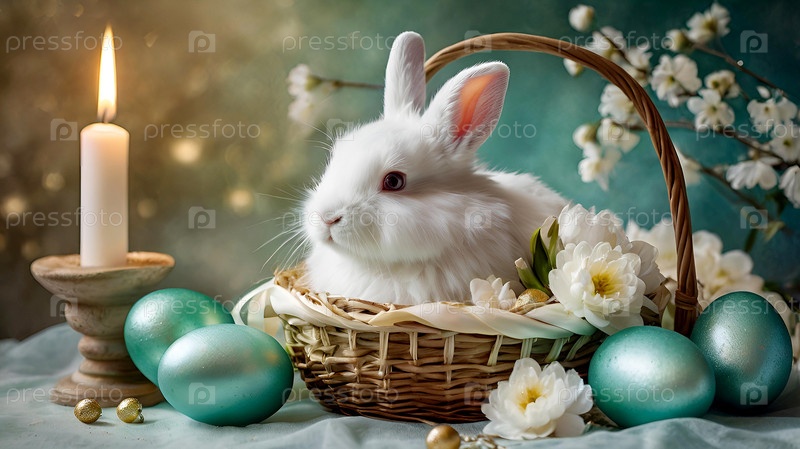 Нежные пасхальные яйца, кролик и деликатные цветы на пастельном акварельном фоне с нежными венами