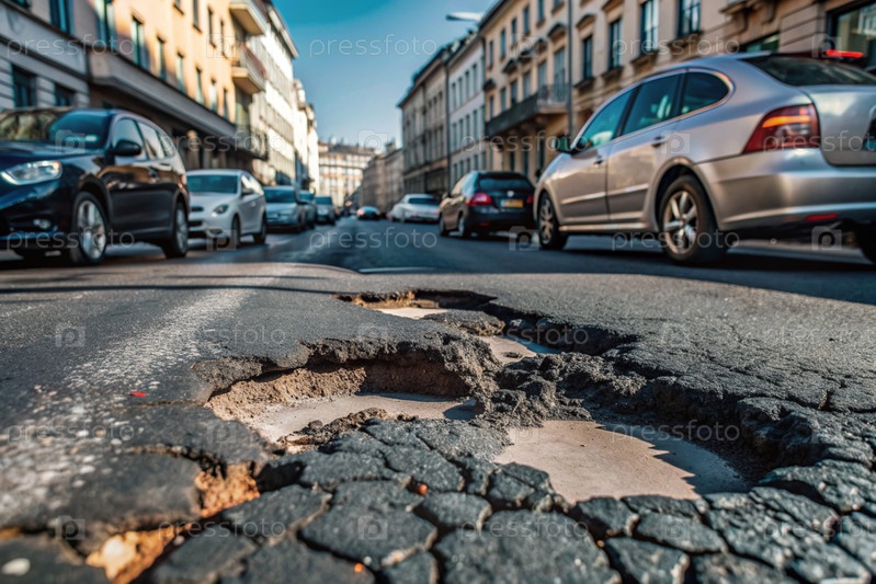 Ужасное состояние дорог. дыра в асфальте на городской улице. ремонт дороги. городская улица плохого качества