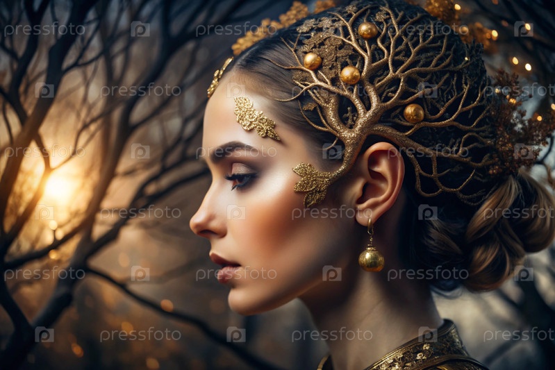 Творческий баннер для салона красоты в черно-золотом цвете. Красивая женщина, окруженная лесом с макияжем и волосами. Золотые ветви дерева в волосах. Индустрия красоты
