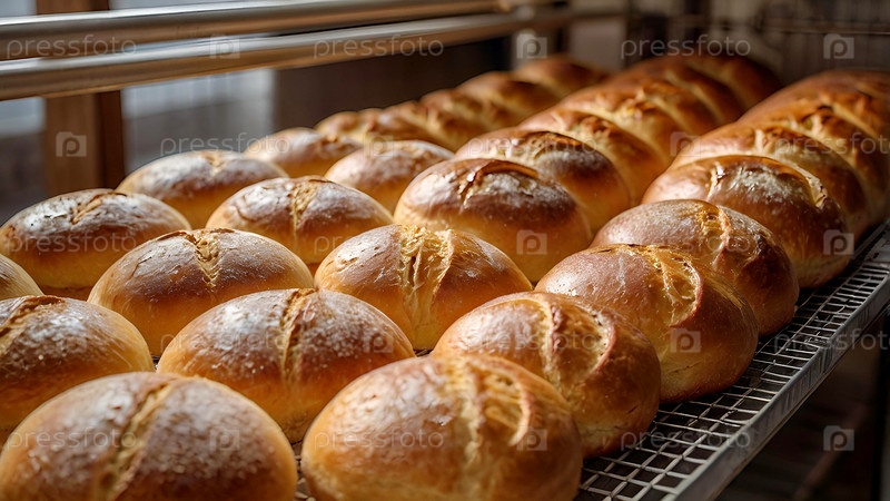 Печьте хлеб на фабрике. Свежий вкусный хлеб в пекарне. Свежевыпеченный кисломолочный хлеб с золотой корой на фабрике. Контекст пекарни со вкусным хлебом