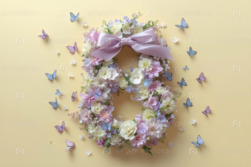 Международный женский день. баннер, флаер, красивая открытка на 8 марта. цветы в форме цифры восемь и бабочки на желтом фоне