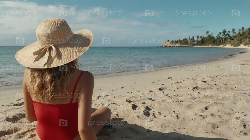 Женщина на отдыхе, сидящая в купальнике и соломенной шляпе с широкими краями на пляже в солнечный день и смотрящая на море
