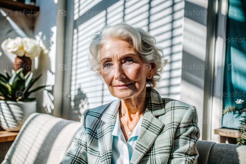 Минимализм.Студийный портрет стильной, элегантной пожилой женщины, 70-летнего пенсионера в интерьере и одежде спокойных тонов.Концепция пожилых людей