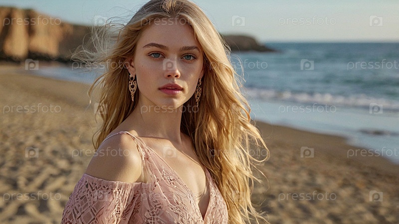 Портрет красивой женщины на пляже перед морем.Романтическая, спокойная и чувственная фотография девушки в проветренном нежном платье