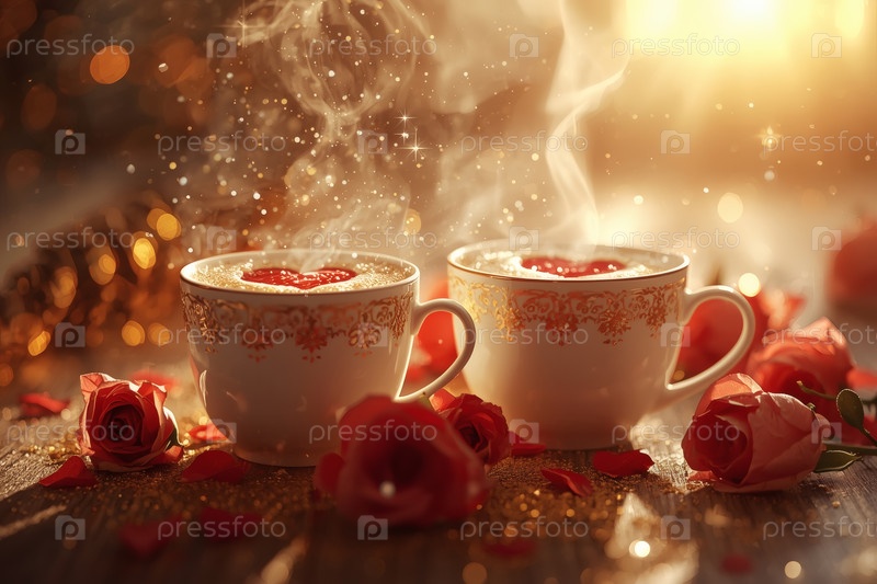 Чашки горячего кофе или чая, окруженные красными цветами и сердцами в День святого Валентина