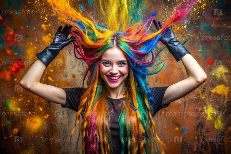 Творческий баннер для салона красоты или парикмахера. Модное профессиональное окрашивание волос. Красивая молодая девушка-подросток с длинными многоцветными волосами. Взрыв цветов на голове
