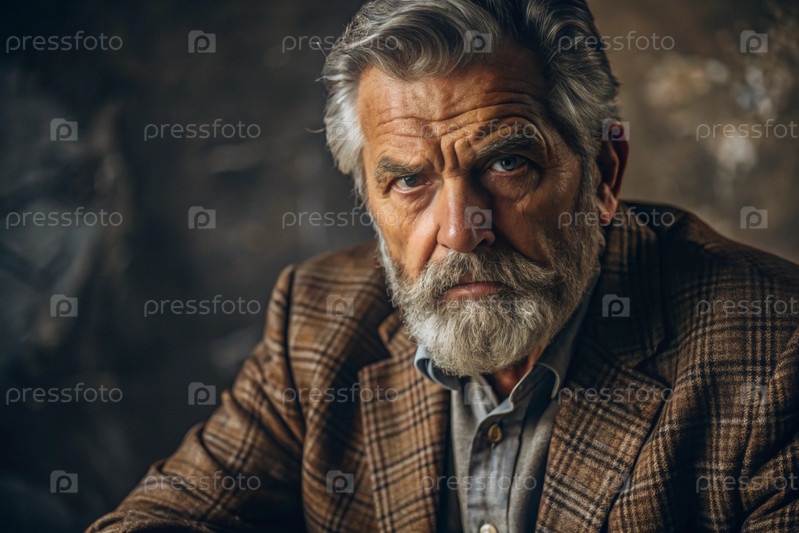Студийный портрет стильного, элегантного пожилого мужчины в возрасте 70 лет, одетого в квадратную куртку в коричневых тонах