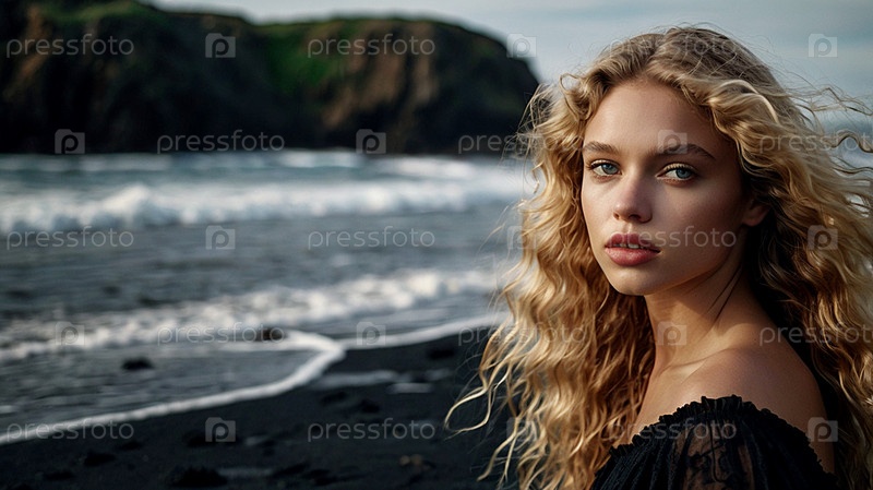 Портрет красивой женщины на пляже с черным песком против моря.Романтическая, спокойная и чувственная фотография девушки в нежном чёрном платье