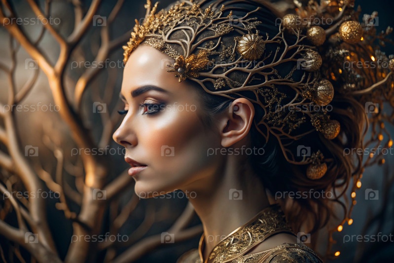Творческий баннер для салона красоты в черно-золотом цвете. Красивая женщина, окруженная лесом с макияжем и волосами. Золотые ветви дерева в волосах. Индустрия красоты