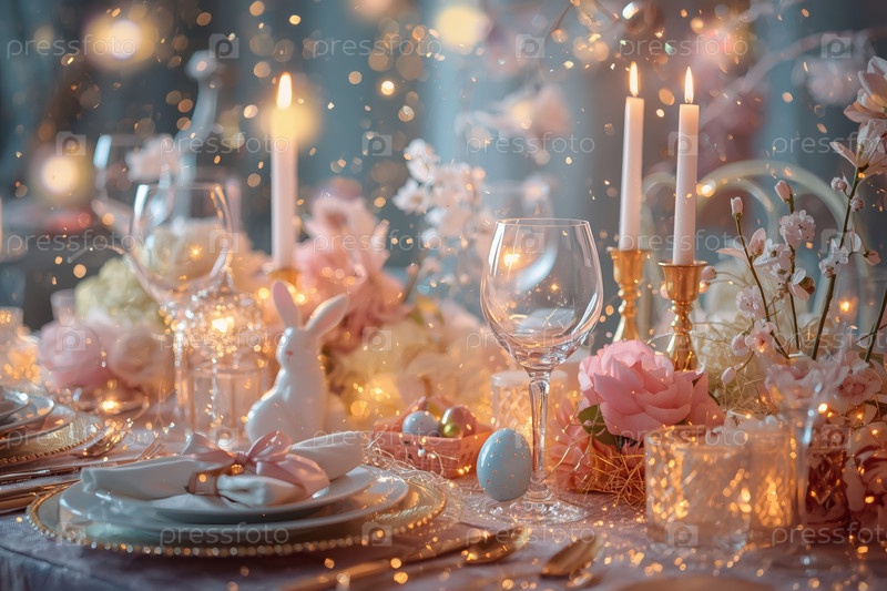 Пасхальный баннер 2026. декоративная тарелка, столовая посуда, стаканы, пасхальные яйца и кролики. концепция празднования Пасхи для кафе и ресторанов