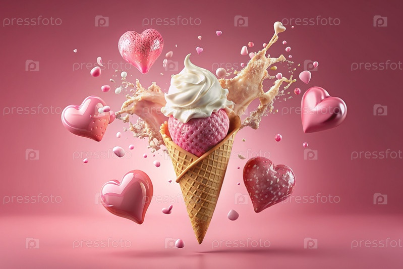 Сладкий десерт. Любовь к мороженому. Сердечно-образный конус мороженого с брызгами, сердцами и пятнами. Концепция Дня святого Валентина. Баннер, реклама