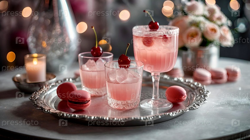 Элегантные мягкие розовые коктейли с льдом и морозом в винтажных бокалах на серебряном подносе с вишней и макаронами