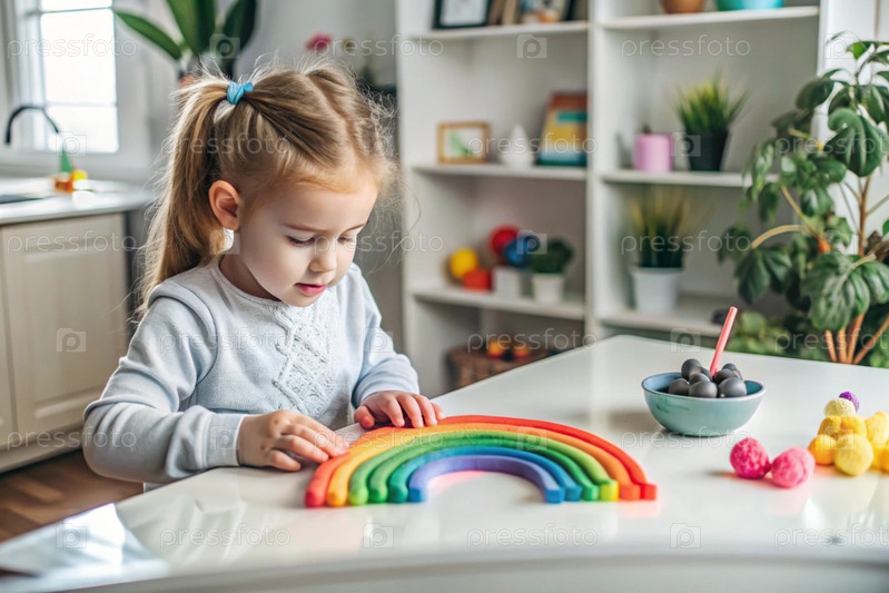 Игрушки.Маленькая девочка играет в образовательные игры.Радужная детская игрушка, цветные пирамиды и логические игрушки для детей.Монтессори-игры для развития ребенка
