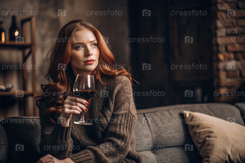 Современная, стильная, красивая женщина с рыжими волосами и бокалом красного вина на стуле в гостиной дома