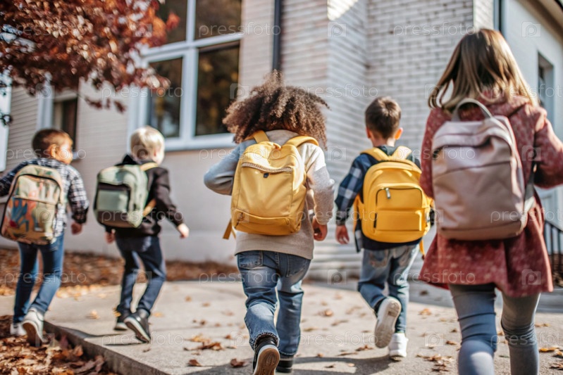 Праздник приходится на 1 сентября. Дети с желтыми рюкзаками бегут в школу. Обратный взгляд. Давайте вернемся в школу. Концепция нового учебного года в школе. Осенний день знаний