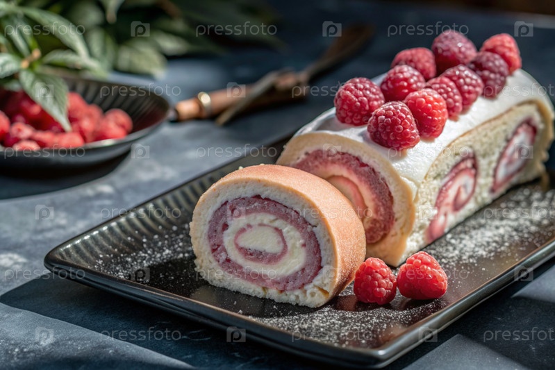Швейцарская губка с малиной, вкусный фруктовый и сливочный десерт наполненный кремовым сыром, украшенный свежими малинами