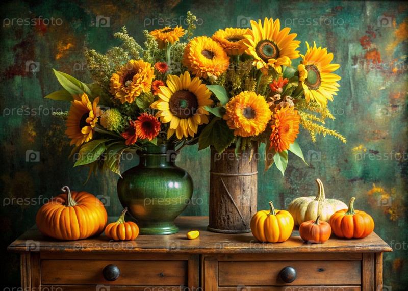 Красивый осенний букет желтых подсолнечников и пшеницы в вазе и декоративные тыквы на древнем деревянном шкафу. Букет цветов в вазе во внутренней части дома. Желтый, зеленый цветочный фон