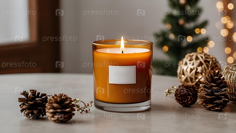 Дизайн уютной горящей свечи из янтарного стекла с пустой белой этикеткой в праздничном, новогоднем интерьере дома